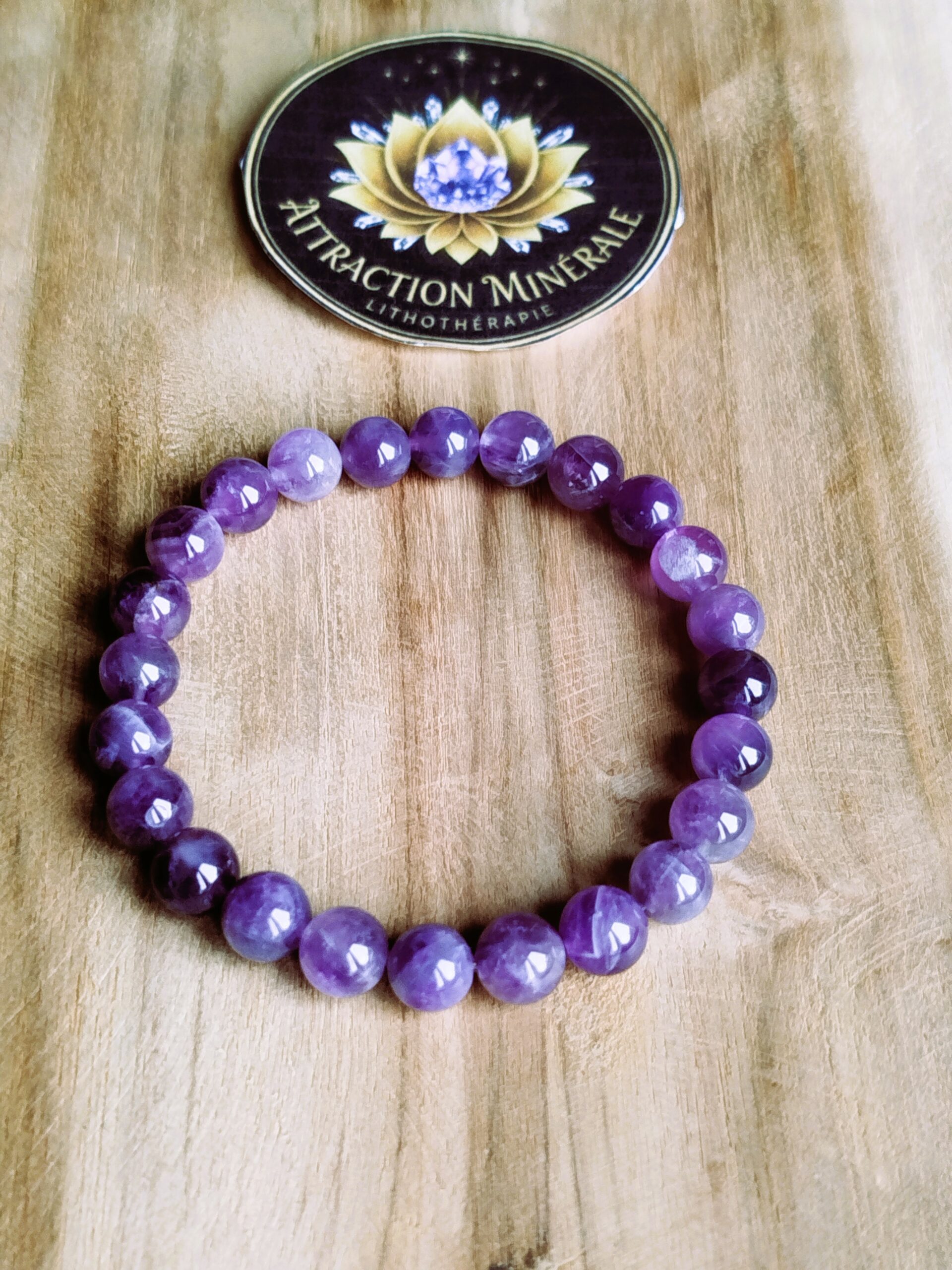 Chaque bracelet est composé de perles de 8 mm aux nuances variées. Selon la lumière, vous observerez des éclats violets translucides ou des reflets lilas plus profonds. Puisque chaque pierre est extraite de la nature, votre bijou est rigoureusement unique.