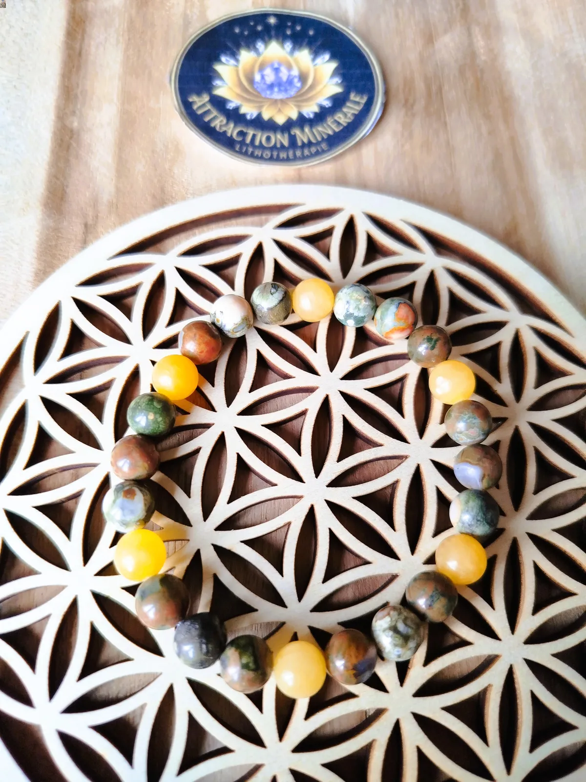 Le conseil de Sabrina : Ces pierres de terre et d'action demandent un entretien régulier pour conserver leur dynamisme. Pour purifier votre bracelet en profondeur, je vous conseille de le déposer quelques heures sur l'une de mes Fleurs de Vie en bois sculpté (vous la trouverez dans la rubrique "accessoires" du site). Issue de la géométrie sacrée, cette plaque de rechargement est le support idéal pour vos pierres et vos bijoux sans les altérer.