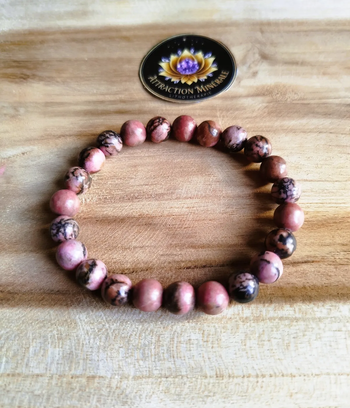 Qualité des perles : Perles rondes de 8 mm en Rhodonite véritable, sélectionnées pour le caractère unique de leurs marbrures.